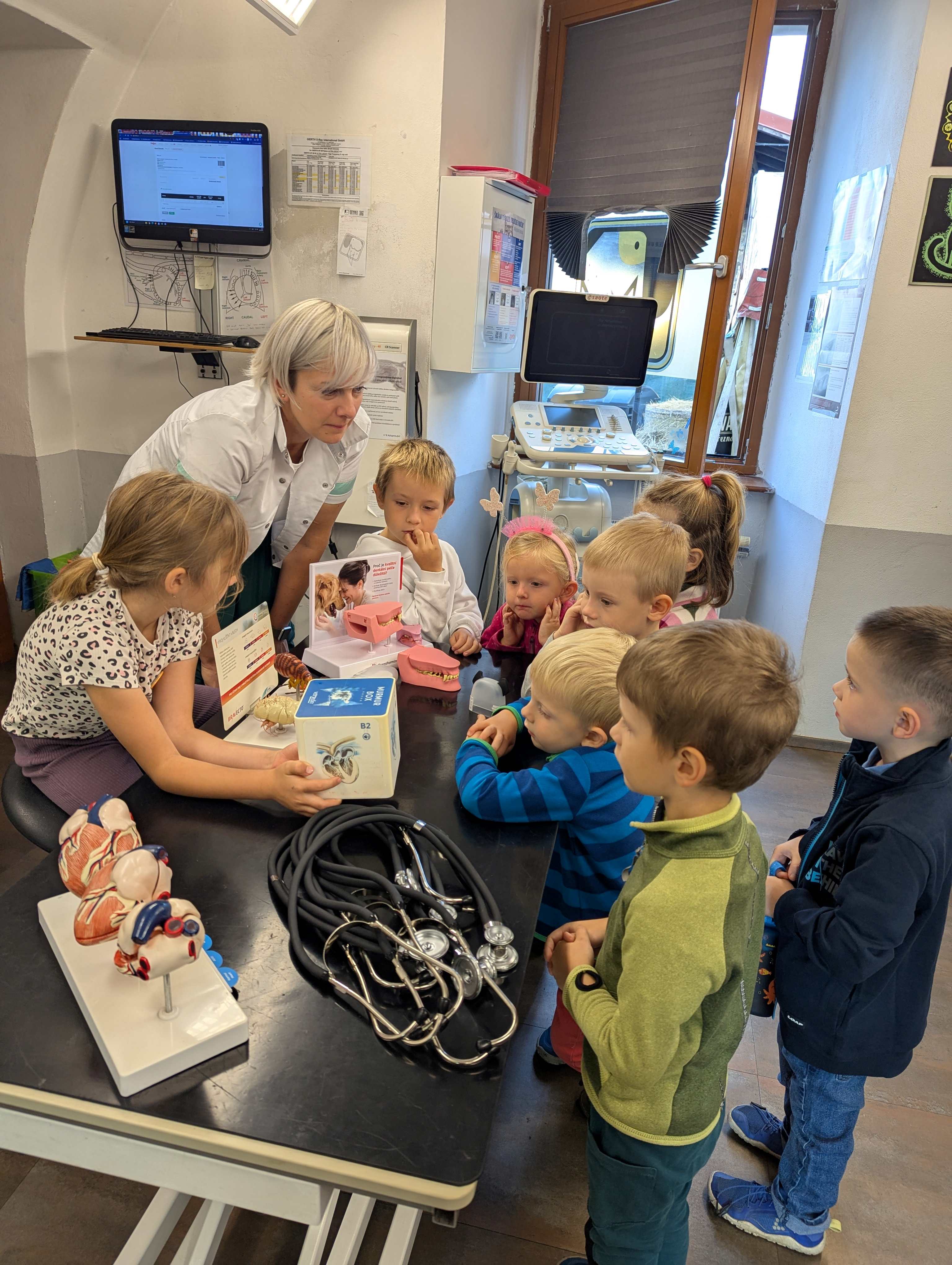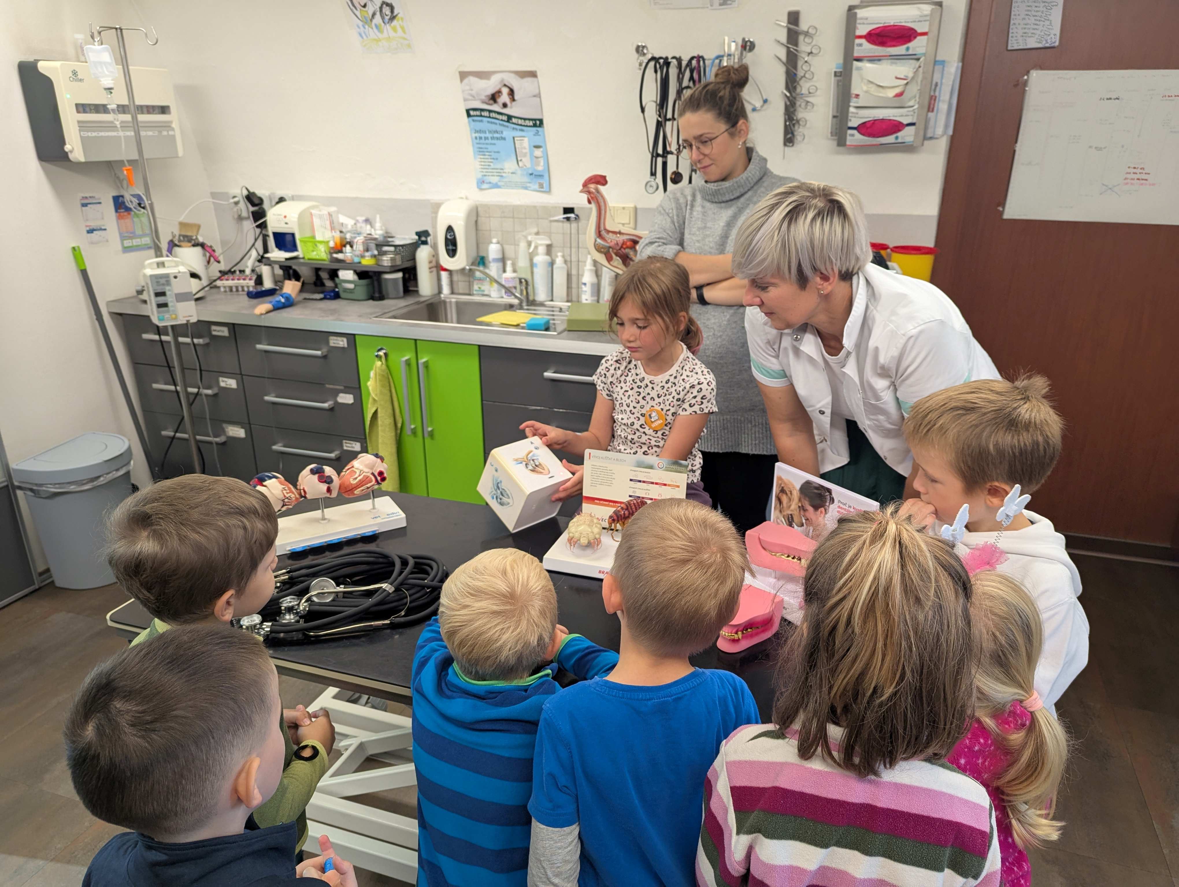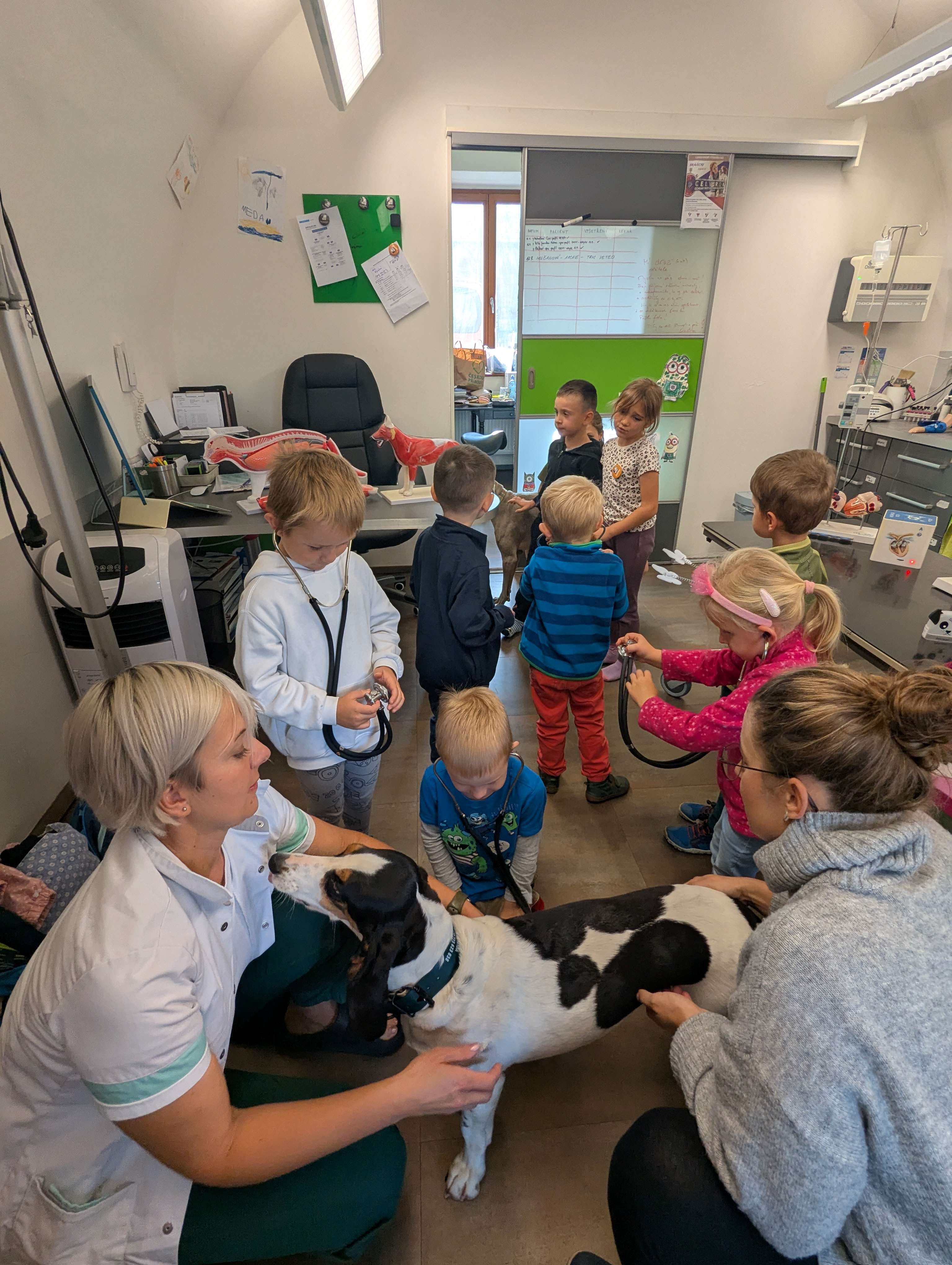 Návštěva veterinární ordinace CityVET byla pro děti velkým zážitkem. Děti se s nadšením rozhlížely po ordinaci a se zájmem poslouchaly vyprávění o tom, jak se pečuje o zvířátka. Dozvěděly se, čím veterinář zvířatům pomáhá, co všechno ke své práci potřebuje, a mohly si některé pomůcky zblízka prohlédnout. Nechyběly ani zvídavé otázky a úsměvy na tvářích. Celá návštěva byla pro děti veselým a poučným setkáním, na které budou dlouho vzpomínat. Velké poděkování manželům Citovým a Medušce.