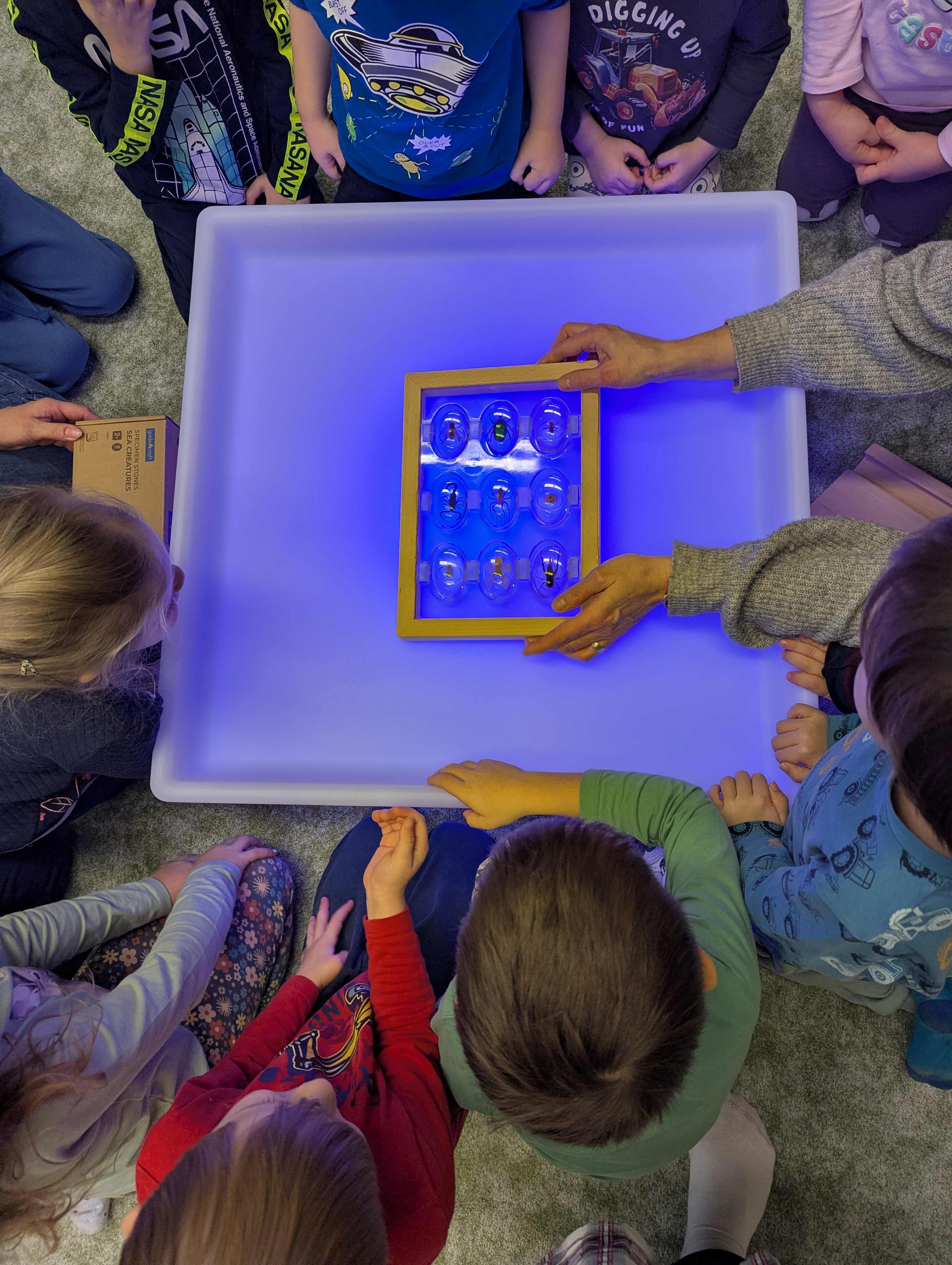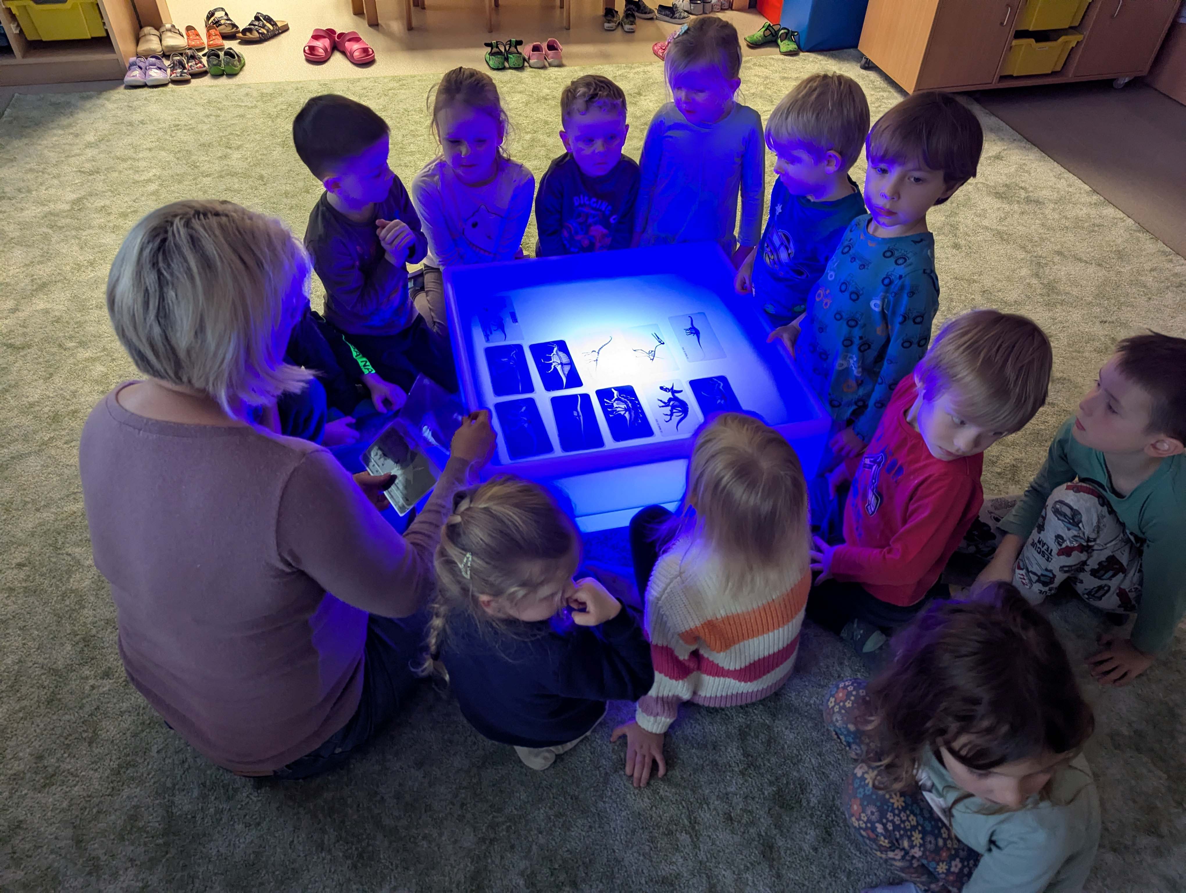 Děti pracovaly s novými didaktickými pomůckami – světelným stolem, rentgenovými snímky, živočichy v pryskyřici a s nadšením objevovaly nové možnosti poznávání.