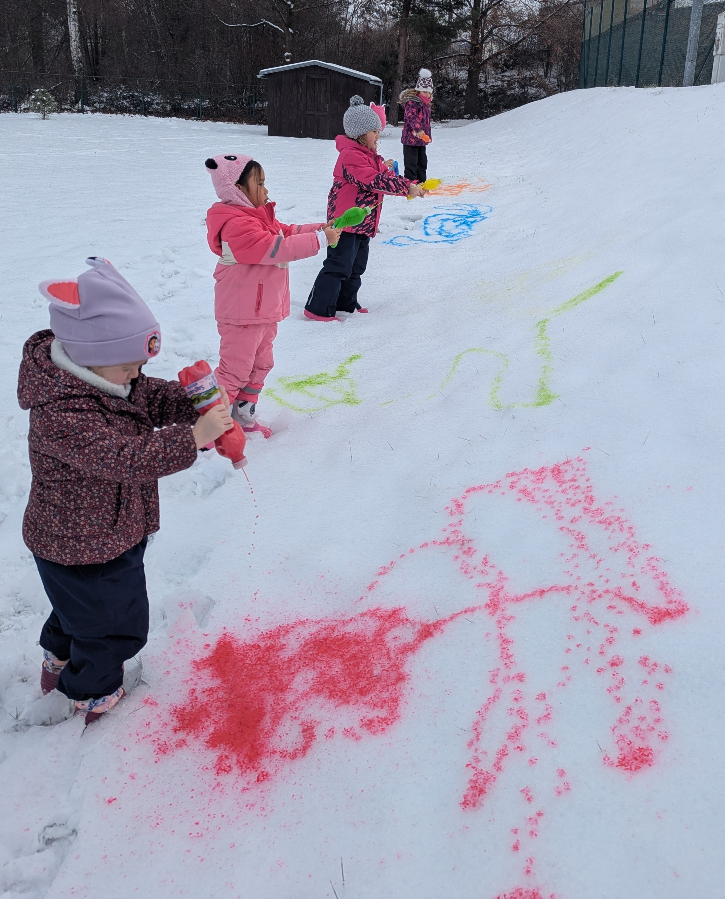 Děti dnes malovaly trochu netradičně. Využili jsme sníh jako velké malířské plátno. Děti experimentovaly s barvami v PET lahvích, které stříkaly do sněhu, a rozvíjely tak svou fantazii i jemnou motoriku.
