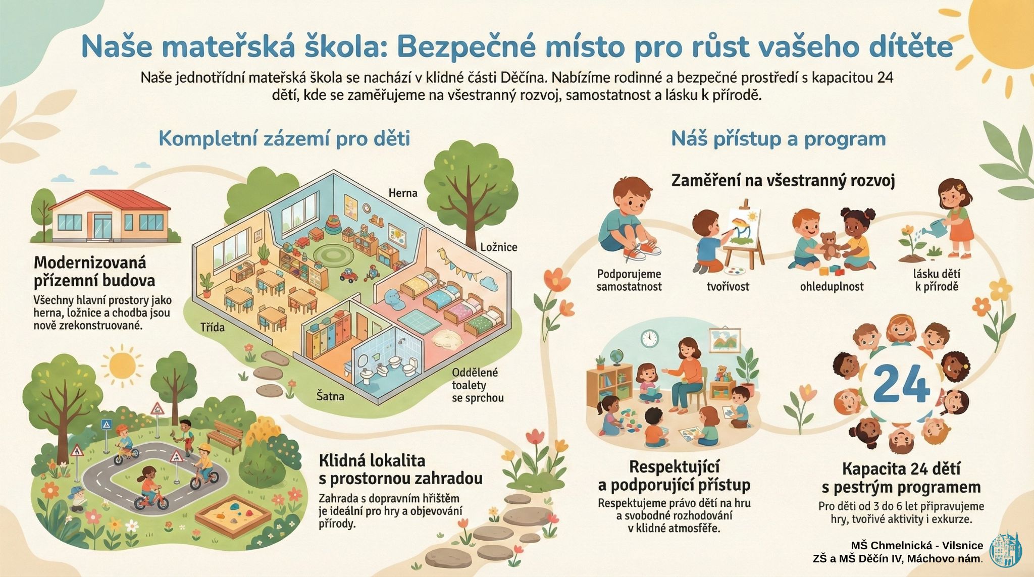 Naše mateřská škola se nachází v klidné části Děčína a nabízí dětem bezpečné, rodinné a přátelské prostředí. Součástí školy je prostorná zahrada s dopravním hřištěm, která je ideální pro hry, pohybové aktivity i objevování okolního světa. Okolí školy umožňuje také krátké vycházky do přírody, během nichž děti poznávají své okolí a učí se vnímat přírodu kolem sebe.