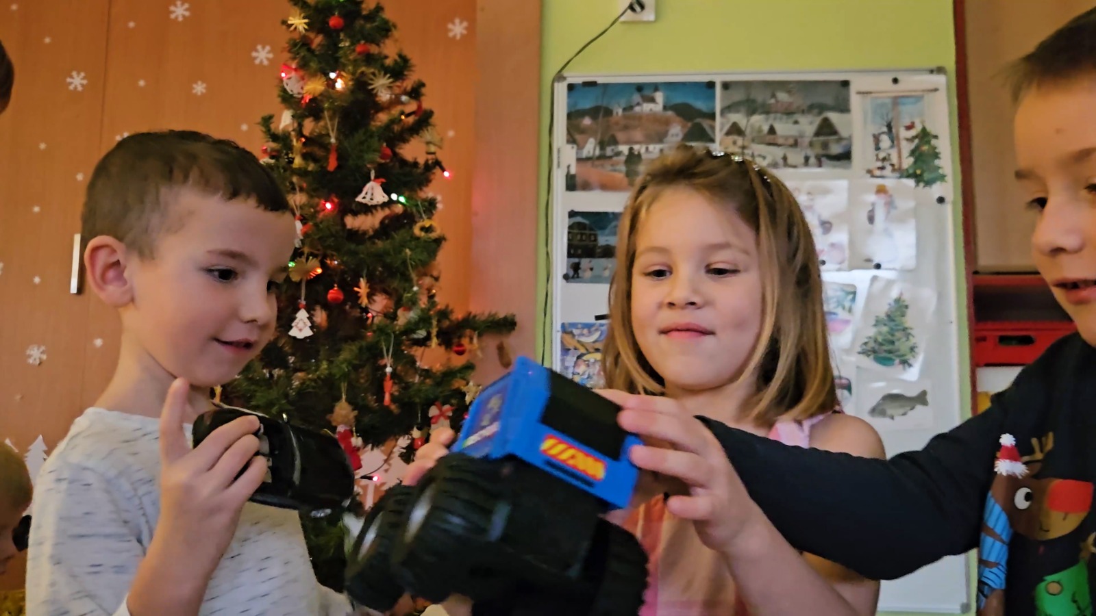 K Vánocům neodmyslitelně patří i dárečky, a tak ani naše děti nebyly ochuzeny. Ježíšek jim přinesl krásné dárky, ze kterých měly obrovskou radost. Děti si nadšeně rozbalovaly balíčky, objevovaly překvapení uvnitř a těšily se z každého malého pokladu. Vznikla přitom příjemná a veselá atmosféra, plná smíchu a spokojených výkřiků, a bylo vidět, jak moc si děti tento slavnostní okamžik užívaly.